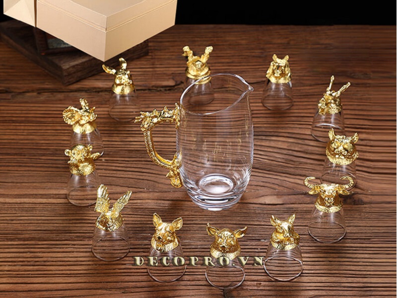 Với sự góp mặt của bộ ly rượu 12 con giáp mạ vàng, tủ rượu của căn nhà bạn sẽ trở nên độc đáo và sang trọng ngay lập tức. Bộ sản phẩm đồ trang trí phòng khách này được làm bằng thủy tinh và đáy ly được mạ vàng nổi bật. Nó không chỉ thể hiện đẳng cấp, sự hiểu biết của gia chủ về 12 con giáp mà còn thể hiện được sự tinh tế của gia chủ khi tiếp đãi khách.