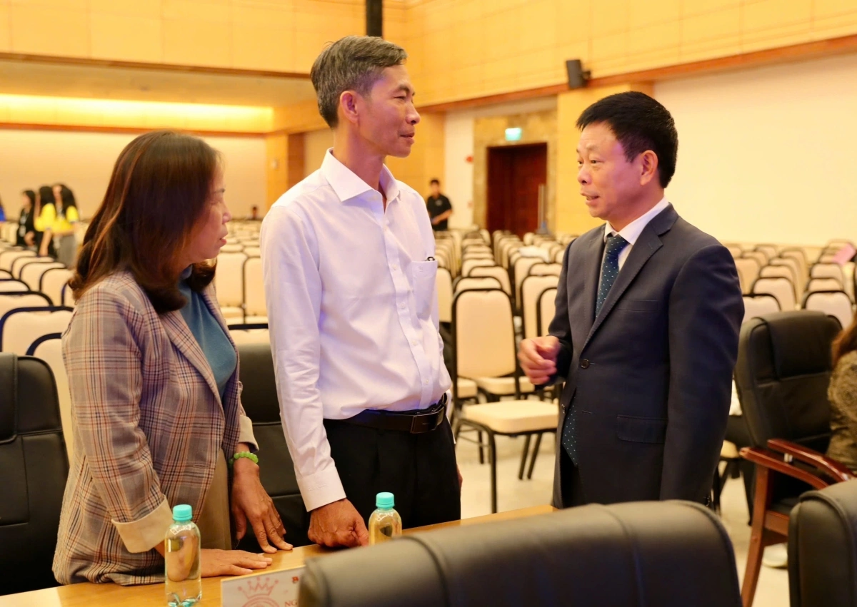 Bố mẹ của Hà Trúc Linh (trái) trò chuyện cùng trưởng ban tổ chức cuộc thi - nhà báo Phùng Công Sưởng. Họ từ quê nhà vào TP HCM để chia sẻ niềm vui cùng con. Ông Hà Văn Phúc nói vẫn còn nguyên vẹn cảm xúc như hôm chung kết khi thấy con đội vương miện, đồng thời muốn Trúc Linh sớm thu xếp để về thăm quê hương, chung vui cùng bà con.